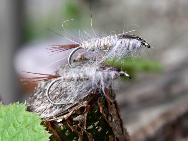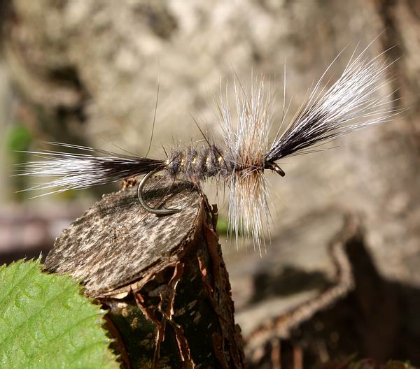 Grey Wulff und Variante in gelb Bindeweise (hier die irische Variante, speziell für den Lough Derg): Hakengröße 6, 8, leichter Nassfliegenhaken z.B. Kamasan B 170, Eichhörnchenschwanz für Schwanz und Flügel, der Flügel wird nicht geteilt, nur über dem Öhr leicht angehoben, Körper blaugraues (blue dun) oder gelb-olives Seehundsdubbing oder Ersatz dick gewunden, Hecheln blaugrau (blue dun) und ginger bzw. blaugrau und gelb (oder Grizzly gelb gefärbt). Einzeln oder zu zweit trockengefischt. Am Fluss ist die Grey Wulff in der Originalbindeweise Hakengröße 8, 10 besser. |