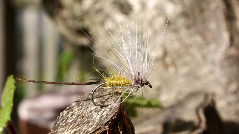 Mosely Mayfly Bindeweise: Hakengröße 8, 10, 2x lang, z.B. Kamasan B 830, Fasanenschwanz 3 4 Fibern, Körper Hare´s Ear und gelbes Seehundsdubbing oder Ersatz, 1:1 gemischt, Hecheln oliv, blaugrau und leichtes Pink, nacheinander durcheinander gewunden, die Hecheln werden unterhalb des Hakenschenkels weggeschnitten, noch besser mit einer Kreuzwicklung nach oben gebunden. Wird auf dem See oder am Fluss trocken
