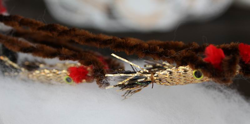 Rang 4 wird belegt vor der sehr originellen wie auch aktuellen Weihnachtsfliege von Torsten Zurheide: Er schreibt dazu: "... hier ein Muster, gebunden mit / auf zwei Hechthaken, Dentaldraht, Chenille, Fell, Geflechtschlauch u.a. Die vier Goldfische ziehen den Schlitten in die Äschenregion - zur Bescherung der dortigen Angler / Fliegenfischer...". Länge dieses Werkes: 18,5 cm Man beachte die Ladung im Schlitten... Eine tolle Idee und super umgesetzt! |