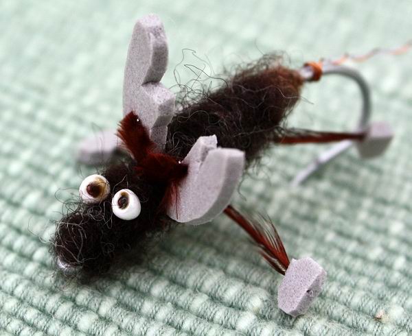 Schneemann von Marry de Jong alias zeenimf aus den Niederlanden. Die Basis dieser schönen Idee bildet ein schwerer Salzwasser-Haken. Der Schneemann hat eine Angelrute in der Hand und angelt Geschenke aus einem Eisloch. Höhe dieser Fliege (inkl. Reisigbesen): 10 cm. Eine toll umgesetze Idee, die mehr als nur den letzten Platz verdient hätte! |