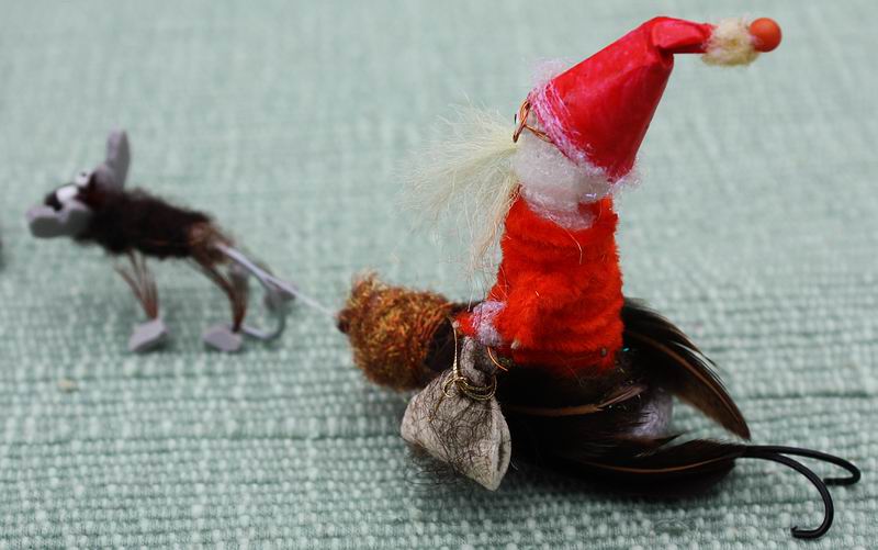 Sie besteht aus einem mit dem "Santa" besetzten Schlitten, auf einem Lachszwillingshaken gebunden. Alle wichtigen Details sind vorhanden: Rote Jacke & Zipfelmütze, Rute & Sack, Brille & Bart... Gezogen wird der Schlitten von zwei einzelnen Elchen, die etwas schielend und schon recht abgespannt daherkommen und auf Einzelhaken gebunden wurden. Verblüffend ist die Fingerfertigkeit des Binders und dessen Liebe zum kleinen Detail. *** |