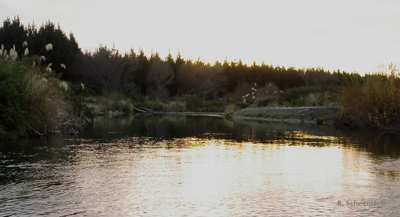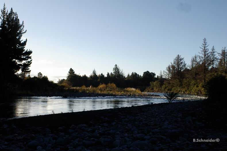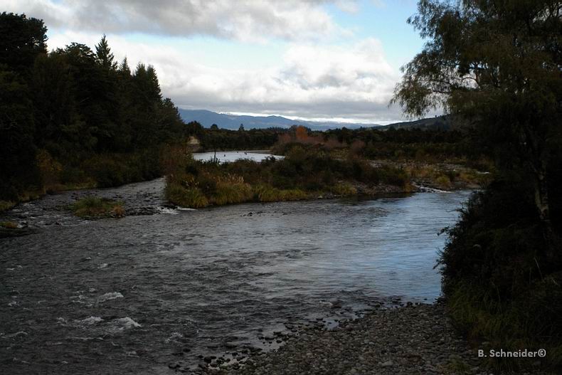 *** Endlich da! Nach einem 15-stündigen Flug von Buenos Aires nach Sydney, von wo aus es nach vier Tagen weiter nach Auckland ging, um dann mit dem Bus nach Taupo ins Zentrum der Nordinsel zu fahren. Dort Vorräte und Angellizenz besorgt und Schläue eingeholt im Angelladen, noch ein paar Fliegen gekauft... Der Mann aus dem Laden hat mir die Flüsse Hinemaiaia, Tauranga Taupo und natürlich den Tongariro empfohlen. Alle drei fließen südlich in den Lake Taupo, den mit 616km² flächenmäßig größten See Neuseelands. Der Tauranga Taupo ist mit einer Durchschnittsbreite von ca. 15 Metern größer als der Hinemaiaia mit ca. 10 Metern. Von ihrer Charakteristik sind die beiden Flüsse sehr unterschiedlich: Der Tauranga Taupo mäandert in weiten Kurven und hat große Sandbänke gebildet. Auch sind die Ufer meist frei von Bäumen und allenfalls mit Büschen bestanden. Das Wasser ist oft glasklar und es gibt viele langsam fließende Strecken und große, tiefe Pools. Als ich ankam, war der Wasserstand sehr niedrig, da es vier (!) Monate nicht geregnet hatte. Im allzu klaren Wasser konnte ich reihenweise Regenbogenforellen bis ca. 50 cm und mehr ausmachen, die mich leider genauso klar ausmachen konnten und allgemein wenig aktiv schienen. |