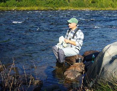 | Matthias in der Glomma - beim Befischen einer guten Stelle ... |