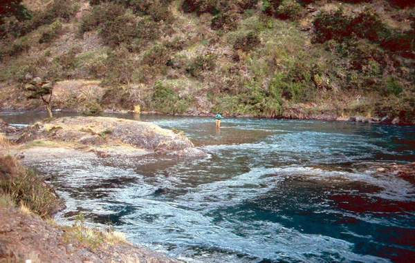 Am Rio Cochrane, Chile - Patagonien 2001. V.Engelmann befischt eine der Topstellen in diesem grandiosen, klarem Fluss voller wilder Regenbogenforellen.