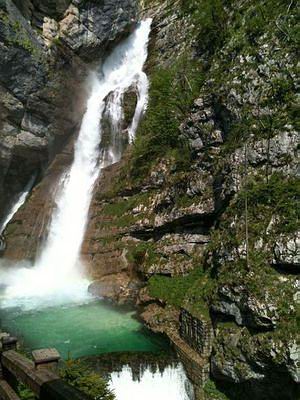 An einigen anderen Stellen fischten wir mit eher weniger Erfolg, bis sich an diesem Tag eine Tungsten-Nymphe mit orangem Schwänzchen als sehr erfolgreich herausstellte. Diese brachte noch eine schöne Regenbogenforelle von ca. 45cm und am Abend eine Bachforelle von etwa 35cm ein. Dazu muss man sagen, dass diese Fische an einer Stelle bissen, die etwas abseits der leicht zugänglichen und damit viel befischten Stellen lag. Nachdem wir einen Tag zum Erkunden des Wasserfalls der Savica nutzten (siehe Foto rechts), brachte uns auch am zweiten Angeltag die Taktik Erfolg, eher weniger befischte Stellen zu suchen. So fand ich ein Stück flussab des Campingplatzes eine schöne Stelle, an der zuerst einige Äschen auf die Trockenfliege stiegen, die ich jedoch leider nicht haken konnte. |