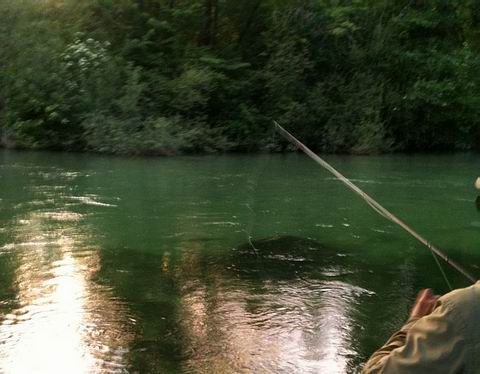 Nach einer kurzen Cafepause zog es uns wieder zurück ans Wasser. Dort erlebten wir noch einen schönen Abendsprung, während dem mein Vater noch die eine oder andere schöne Forelle landen konnte. Auch konnten wir in dem glasklaren Wasser eine sehr große Forelle ausmachen, die ihren Standort vor einem im Wasser liegenden Stein bezogen hatte. Allerdings ließ diese sich nicht für unsere Fliegen interessieren. |