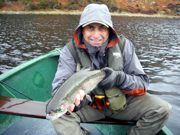 Das Wetter meinte es wieder einmal nicht gut mit uns, aber wir waren entsprechend angezogen (danke an die Firmen Simms und Patagonia für ihre tollen Produkte!). Sie wissen ja, es gibt kein schlechtes Wetter, sondern nur die falsche Bekleidung dazu. Kaum hatte Archie mich bis in die Mitte des Lochs gerudert, als ein Graupelschauer mit heftigen Windböen auf uns niederprasselte, teilweise konnte ich vor lauter Regen noch nicht einmal das Ufer sehen. Sie können sich sicher vorstellen, wie Würfe mit der Fliegenschnur bei solchen |
