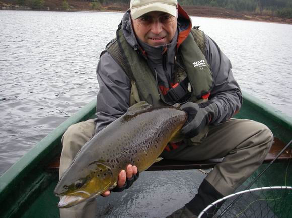 | Eine Brown Trout von geschätzten 13-14 Pfund! Unglaublich, aber mein erster gefangener Fisch aus dem „Secret Loch“ war eine Brown Trout in einer schier unglaublichen Größe! Wir machten schnell ein paar Photos (sehr zu empfehlen ist bei solch einem Wetter und auch für die Bootfischerei eine wasserdichte Kamera, ich habe eine Pentax Optio 30W benutzt) und setzten den Fisch behutsam wieder zurück. Die Bilder geben die tatsächliche Größe des Fisches nicht wirklich wieder, aber das vermutete Gewicht ist kein Fischerlatein! | ![]() |