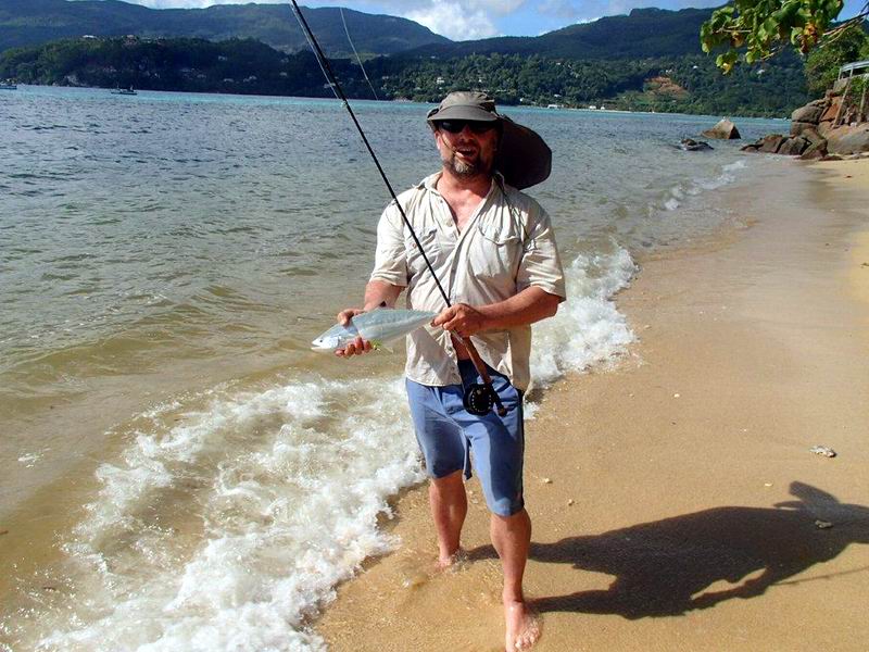 Montag, um 6.45 Uhr nach den Einreiseformalitäten wurde ich von meinem Freund am Flughafen abgeholt. Wir fuhren nach Takamaka zu seinem Haus und nach einer stärkenden Brotzeit ruhte ich mich bis Mittag aus. Gegen 14.00 Uhr sind wir an den Strand gefahren, an dem Herbert ein, zwei Tage zuvor Sardinenschwärme ausgemacht hatte und wir versuchten dort unser Glück. Nach einer guten halben Stunde spritzte das Wasser keine 15 Meter vom Strand entfernt auf. Mit einem kurzen Wurf präsentierte ich meinen selbstgebunden „grünen Clouser“ und mein erster „Giant Trevally“ zog wie verrückt an meiner 9er RPL+. Nach etlichen Fluchten konnte ich ihn landen und nach einem kurzen Fotoshooting schenkte ich ihm die Freiheit wieder. Kurz danach fing Herbert noch einen Sabe (Queenfish) mit der Fliegenrute. Da sich nach dem Drill mit dem Giant Trevally die Schrauben am Rollenfuß meiner Lamson gelöst hatten, fuhr Herbert mit dieser zurück, um sie zu reparieren und um eine kräftige Spinnrute zu holen. Bis zum Abend fischten wir zwar ohne Erfolg weiter aber für mich war dies ein perfekter Einstieg in eine wunderbare Fischerwoche. |