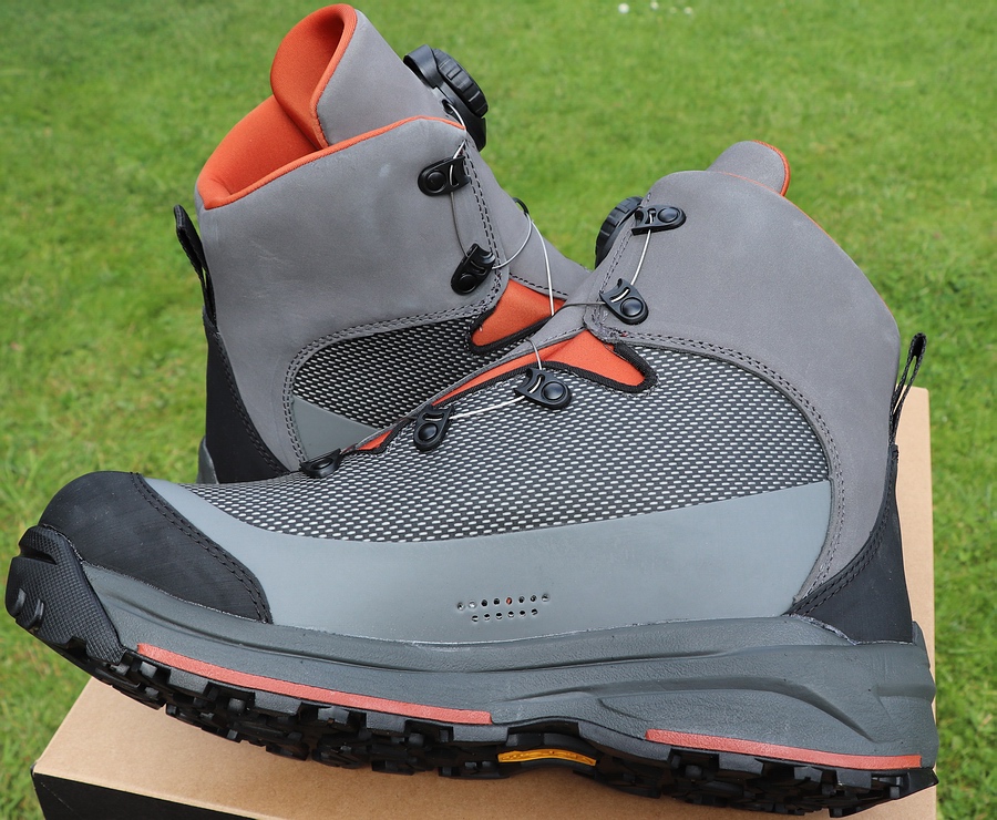 Nach etwas Recherche wurden es die hier vorgestellten Simms Guide BOA, da sie meine wichtigsten Ansprüche an Watschuhe erfüllen: sie kommen von einer Traditionsmarke in sehr hoher Verarbeitungsqualität, besitzen eine stabile Sohle, einen sicheren, verstärkten Umlauf, reichen weit über die Knöchel hinauf und sind relativ leicht, gefertigt aus modernen schnelltrocknenden Materialien. Neben Sicherheit und bestem Tragekomfort sind mir zwei Dinge zudem besonders wichtig: man ist im nassen wie auch in trockenen Zustand in Sekundenschnelle hinein- und herausgeschlüpft und sie besitzen ein s.g. BOA Fit Schnellschnürsystem, welches sich superschnell, einfach und sicher arretieren und wieder lösen lässt und welches die umständliche "Schnürsenkelei" überflüssig macht! Solches habe ich in den letzten Jahren sehr zu schätzen gelernt (auch wenn hier nicht immer alles "Honig" ist). |