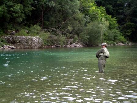 Unser Angeltag an der Idijca gehörte zu den so genannten Sternstunden in einem Anglerleben! Ein schöner Fluss mit einem guten Fischbestand an Regenbognern. Rudi fing alleine an einer Stelle 15 Forellen in Serie, sie waren ohne Ausnahme zwischen 40 und 50 cm groß. Ich fing an diesem tollen Tag den größten Fisch unserer Tour, eine Regenbogenforelle von 67 cm. Wir befischten die Strecke von Tolmin, im Sektor Most na Soci, man findet auf 16,2 Kilometern alles was das Herz höher schlagen lässt. |