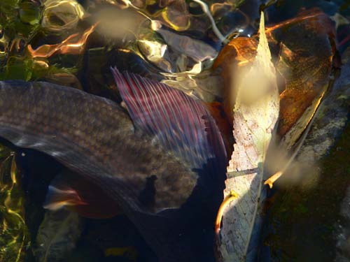 | Als weiteres Problem stellte sich heraus, die Fliege zwischen den unzähligen wunderschönen, verschiedenfarbigen, auf der Wasseroberfläche schwimmenden Baumblätter zu sichten. Es war unzweifelhaft ein Naturspektakel und echt schön, dieses Wunder der Natur zu beobachten. Als der Regen nachgelassen hat, hatte ich bereits 5 schöne Äschen gelandet (da ich ein catch & release Anhänger bin, schenkte ich ihnen wieder die Freiheit) und bewegte mich langsam flussabwärts. Als ich nun eine herrliche Stelle passierte, wo das Wasser schnell fließt und richtig tief ist, die ich meist, wenn ich „auf Trockene „ unterwegs war, meistens nur angeschaut habe und nur mit der Nymphe Huchen und Forellen (Brownies und Regenbogen) gefangen habe, war ich plötzlich Zeuge eines ungewöhnlichen Spektakels. Ich mag zu behaupten dass ich im "Wasser–lesen" | ![]() |