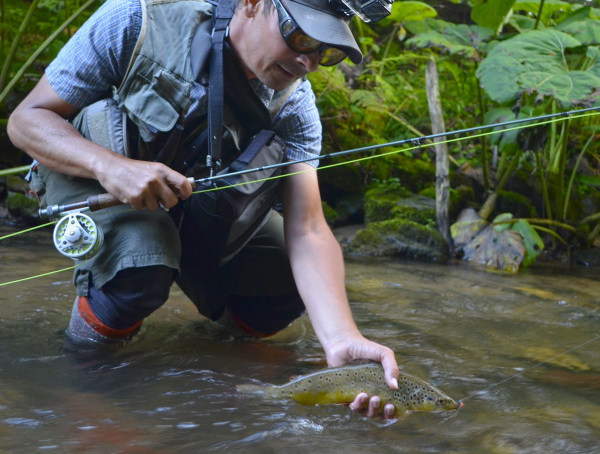 letzte Bachforelle des Tages- der Fischer ist erschöpft aber