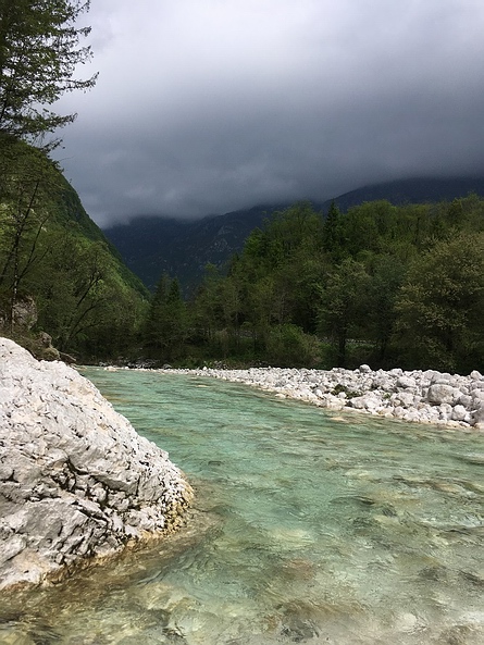 Dort angekommen sticht einem von oben herabblickend das schier traumhaft blaugrüne Wasser ins Auge. Der Fluss mit seinen Felsen und den charakterlichen dunklen, im Wasser liegenden Steinen ist wirklich atemberaubend und für mich der schönste Fluss überhaupt. Das Ganze eingepackt bzw. umgeben von den hohen Bergen der Julischen Alpen (hier gehen unweit vom Ufer die 2000èr in die Höhe). Das ist schon sehr imposant! |