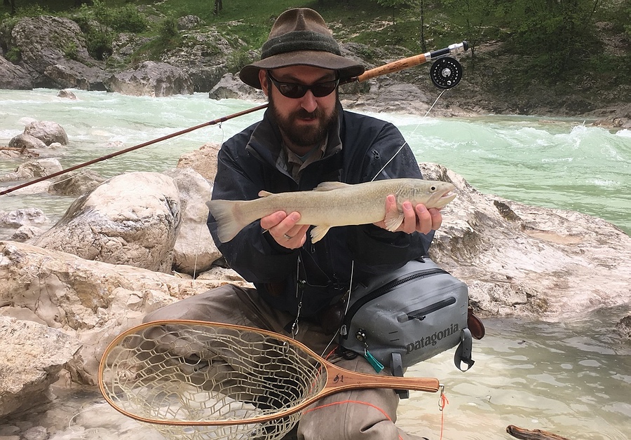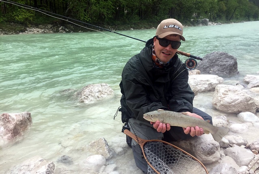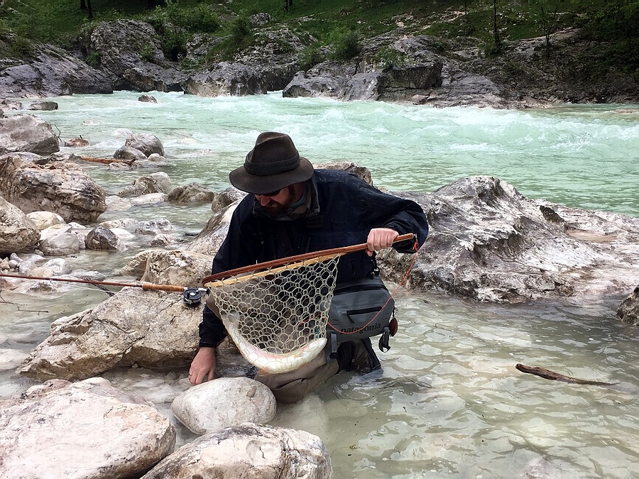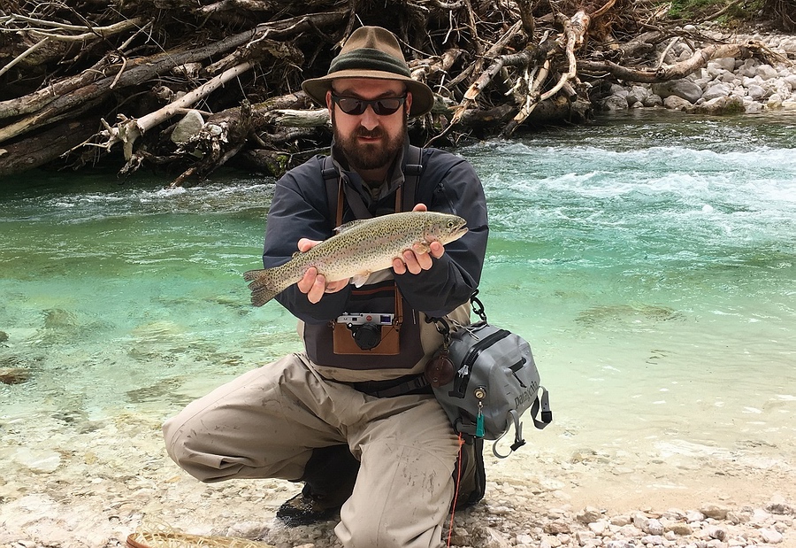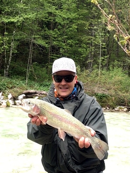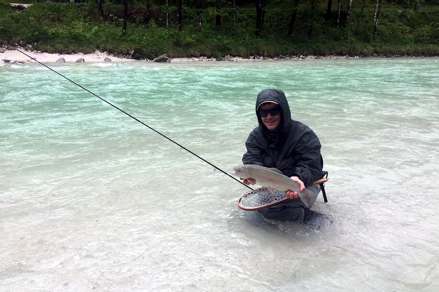 an der Soca eine richtig dicke Regenbogenforelle an seiner Gespließten.