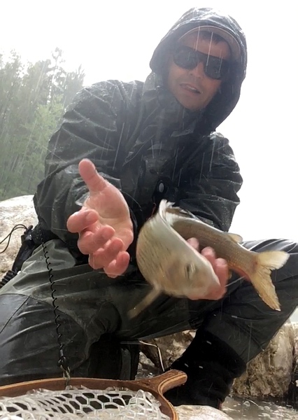 Simon kämpfte sich ebenfalls durch den Regen, der den Pegel weiter steigen ließ, aber auch er konnte dort eine Marmorata und einige schöne Regenbogenforellen fangen. Bei mir lief es ebenfalls prächtig und ich konnte innerhalb kürzester Zeit noch weitere Marmoratas und auch eine Äsche zum Keschern überreden. Wenn ich das so Review passieren lasse, waren wir ständig am Drillen. Eine kräftige Forelle verlor ich, da ich sie nicht halten konnte und diese mir schlussendlich um einen Felsen schwamm, nachdem sie sich aus dem Wasser geschraubt hatte, aber das war eigentlich auch schon egal. Schade war es, dass Simon eine starke Äsche im Drill verlor, denn dann hätte auch er sein Triple komplett gehabt. |