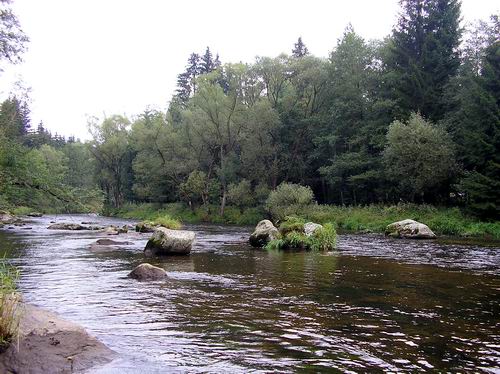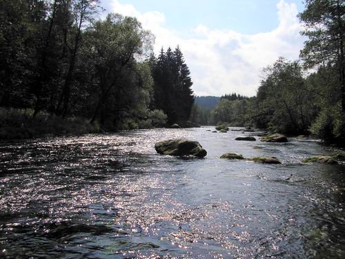 Generell ist der Regen gut zu bewaten, da er neben den Steinen auch viel sandiges Sediment mit sich führt. Der Strömungsdruck kann in einigen Bereichen sehr hoch sein und auch die Tiefe ist nicht zu unterschätzen. Vorsicht ist beim Einsteigen aus den Wiesen geboten, da es viele eingewachsene und überwachsene Stacheldrähte von Viehweiden gibt. Hier hat sich schon so manche teure Wathose verabschiedet. <= Blick von der Stauseebrücke in Richtung Abschnitt 1 |
