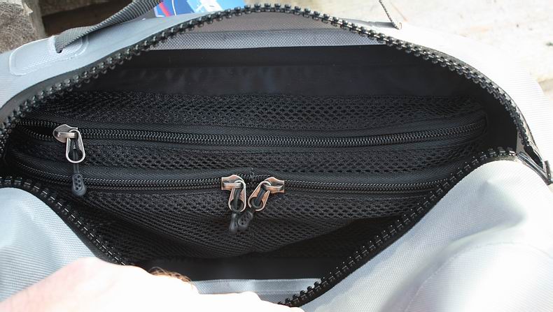 | Der wasserdichte Hauptreißverschluss der Tasche geht baubedingt üblicher Weise etwas schwer, lässt sich aber auch mit einer Hand bedienen. Wichtig ist, diesen beim Schließen am hinteren Ende kräftig "einrasten" zu lassen - damit er auch wirklich zu und das Innenfach damit wasserdicht ist. Mit dem 40mm breiten Hüftgurt kann die Tasche bequem umgeschnallt werden. Eine stabile Schnalle und vier verschiedene Einsteller ermöglichen ein komfortables Anpassen der Einstellungen, ein Rückenpolster an der Tasche sorgt für angenehmen, druckfreien Sitz. Durch entsprechende Lochungen ist die Möglichkeit gegeben, weitere Dinge an die Tasche anzuhängen. Dafür befinden sich hinten an den Gurtenden links und rechts Möglichkeiten, sowie vorne links und rechts - an den beiden Seiten der Tasche. Außerdem lässt sich auf der Taschenfront mit Hilfe von zwei Riemen eine Rute, Trinkflasche etc. festschnallen / fixieren. Wie schon erwähnt, war die Tasche im Praxiseinsatz 100%ig wasserdicht. Bei "Tauchgängen" über Hüfttiefe ist aufgrund der Größe der Tasche ein gewisser Auftrieb vorhanden. | ![]() |