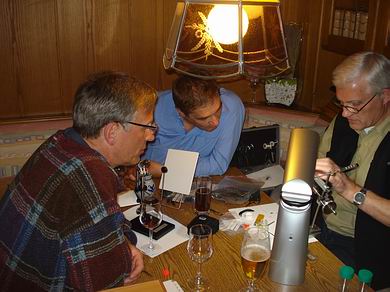 | Nach der Ankunft im Hotel Himmelreich und dem Verzehr von frischem Apfelstrudel mit Vanilleeis hat man erste Pläne für den nächsten Tag geschmiedet. Abends wurden noch einmal die letzten fehlenden Fliegen für den Tag gebunden. Und unser Ulli bekam in der Nacht noch Besuch von einer Mietze... |