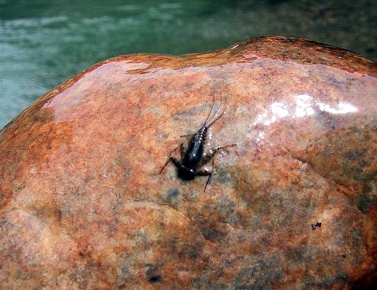 Tiroler Ache in der Nähe von Schleching / Oberbayern. Eintagsfliegenlarven (Steinklammerer, Heptageniidae) waren auch vorhanden.