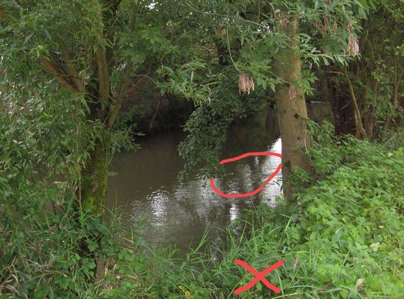 sich einige Meter stromab des vermuteten Fisches im Uferbereich. Dann lässt
