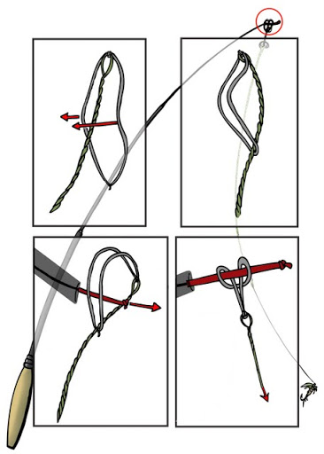 Die Leinen sind meist rutenlang. In bestimmten Situationen kommen aber auch längere Leinen zum Einsatz. Die Befestigung der Schnur an der Rutenspitze erfolgt mit einem Buchtknoten an dem Geflechtschlauch, der an den Ruten fest angebracht ist. |