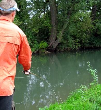 | finden ist. Wird das Zurückführen der Rute sehr zügig durchgeführt, ist das Knäuel an der Flugschnur in der Nähe des Vorfachs zu finden. Anders herum, wenn das Zurückführen der Rute sehr verspätet durchgeführt wird, ist das Knäuelgebilde vor dem Fliegenfischer in der Flugschnur zu finden. |