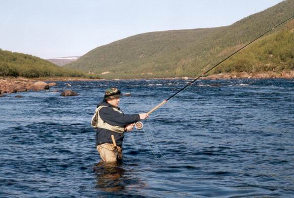 Foto zeigt zur Abwechslung mal mich selbst im Juni 03 am Tenojoki bei der