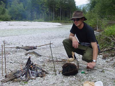 Schotterbänken eine Forelle über ein Feuer zu braten, und zu