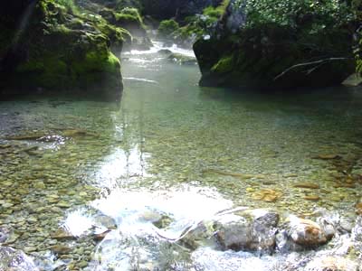Man kann hier in diesem ca. 1km langen „Wildbachabschnitt“ einen ganzen Tag verbringen ohne dass auch nur die Spur von Langeweile aufkommt. Beim Bärenhof (Montag Ruhetag!) bekommt man dann auch seinen wohlverdienten Schluck Wein, und eine einfache Mahlzeit. Der Abschnitt von der Brücke beim Bärenhof bis zur Quelle wird bestimmt durch seichte Rieselstrecken in denen aber keine alzugroßen Fische zu erwarten scheinen. |