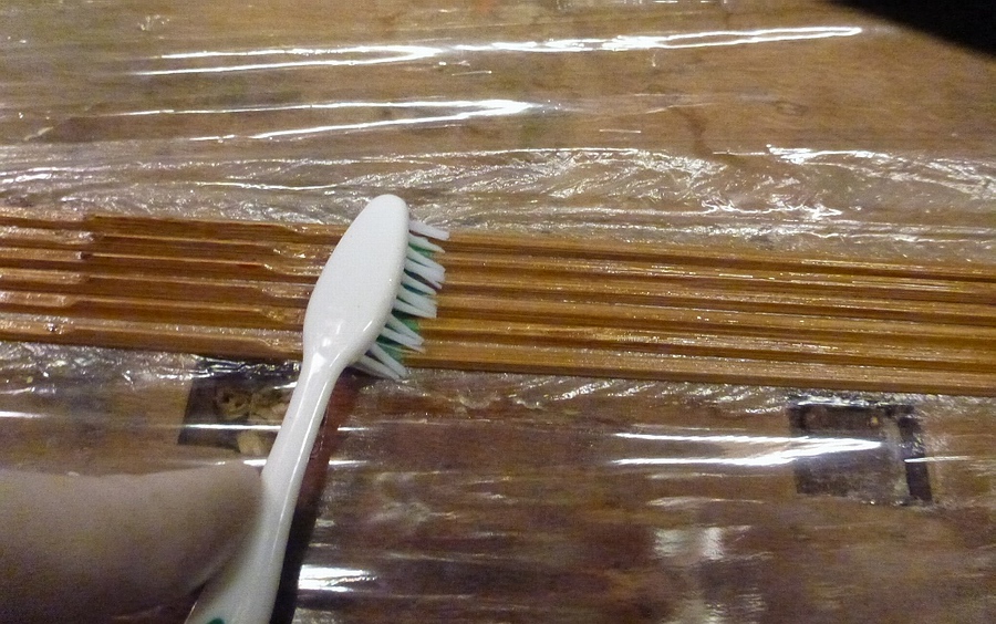 Dazu einen kurz zusammengefassten Einblick. Ganz am Anfang steht das Tonkin-Bambusrohr, welches in einzelne Spleiße gespalten wird. Wenn man genau hinschaut, sieht man die feinen Kraftfasern des Bambus. Nach dem Spalten muss man alle Spleiße mit Hilfe von Hitze richten. Ein sehr wichtiger Arbeitsschritt, womit man versucht, so wenig durchlaufende Kraftfasern wie möglich zu zerstören. |