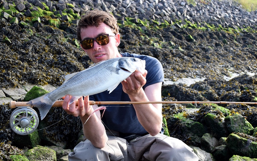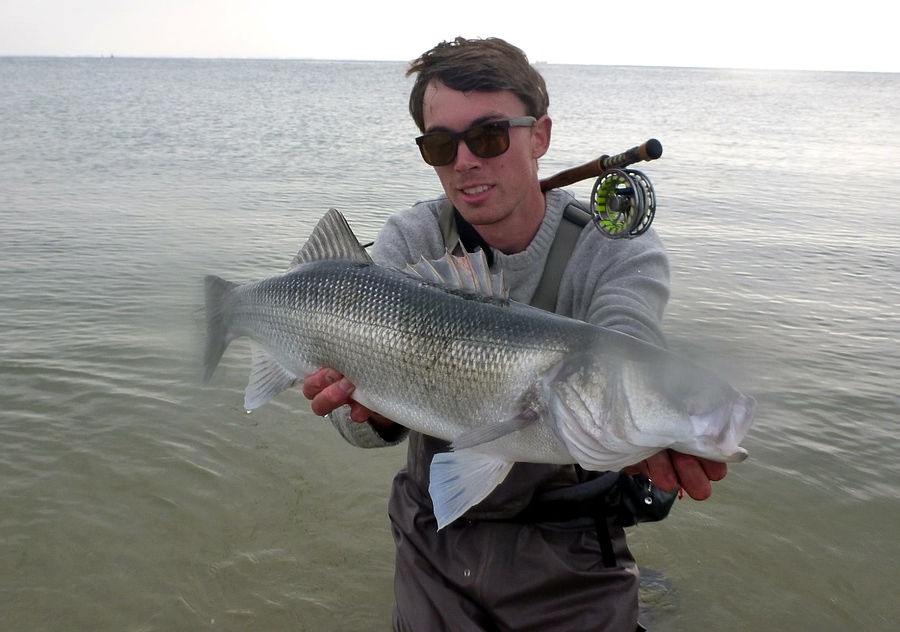 Ab Mai/Juni werden auch an der offenen Küste Barsche gefangen. Das Wasser ist mit ca. 15 Grad noch immer frisch. Die Barsche sind dennoch in allen Größen da. Jetzt gilt es, die Fische zu suchen und eine gute Beißzeit abzupassen. Für mich bilden einige Faktoren die Basis für einen erfolgreichen Angeltag. Zu allererst muss man sich an den Gezeiten orientieren. In der Regel sind 1-2 Stunden vor und nach totaler Ebbe, wie auch bei totaler Flut gute Beißzeiten. Jetzt muss man sich eine Stelle suchen, an der zu dieser Zeit das Wasser strömt und nicht still steht. Die Wolfsbarsche lieben Strömung und Kehrwasser. Das Wasser sollte nicht zu viel Sand mit sich tragen und nicht zu trübe sein. Als Indiz nehme ich beim Waten meine Watschuhe. Solange ich diese noch im hüfttiefen Wasser sehen kann, ist das Wasser noch nicht zu trübe. Wir sind beim Wolfsbarschfischen mit der Fliege vollkommen darauf angewiesen, dass der Barsch die Fliege visuell wahrnehmen kann. Wenn das Meer mehrere Tage nicht zu starkem Wind ausgesetzt war, kann man an manchen Stellen metertief ins Wasser schauen und sieht neben großen Meeräschen auch Sprotten und Sandaalschwärme. Zu guter Letzt spielt auch der Lichteinfall eine nicht unerhebliche Rolle. Meine besten Erfahrungen habe ich in der Dämmerung oder bei bedecktem Himmel gemacht. Bei spiegelglattem Wasser und strahlender Sonne kann es schwer werden. Das ist dann eher Badewetter. Es gibt auch kaum zu starke Brandung oder zu hohe Wellen. Ich kann mich gut an einen Abend in meiner Jugend erinnern, wo ich mit Freunden in einem Sturm in der Dämmerung im schäumenden Wasser stand. Die Wolfsbarsche waren vollkommen außer Rand und Band und bissen wirklich direkt vor unseren Füßen. Das sind natürlich nicht die besten Bedingungen, um mit einer Fliegenrute in der Nordsee zu stehen. |