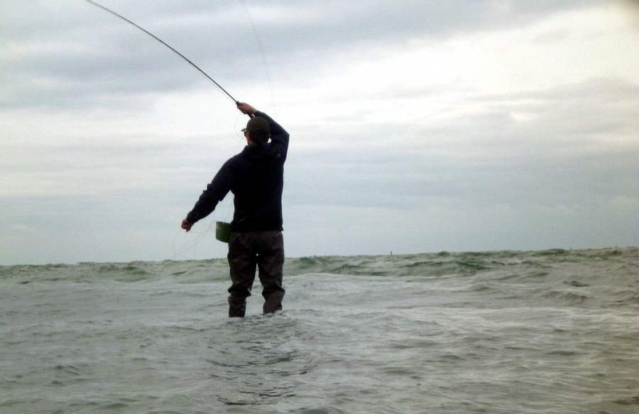 Die Bedingungen an der offenen Küste sind meist rau. Ich kenne keine materialunfreundlichere Fischerei als das Wolfsbarschangeln. Das Salzwasser, die rauen Wellen und scharfen Muscheln verlangen Angler und Gerät einiges ab. Löcher in den Wathosen und zerschnittene Watschuhe gehören zur Wolfsbarschfischerei, genauso wie stark beanspruchte Hände und leere Fliegendosen am Ende eines Angeltages. |