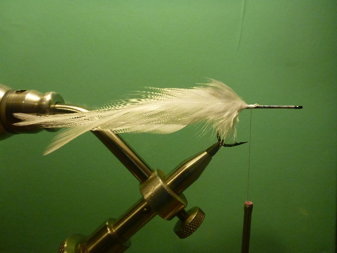 Zuerst werden die drei weißen Hahnenfedern als Schwanz eingebunden. |