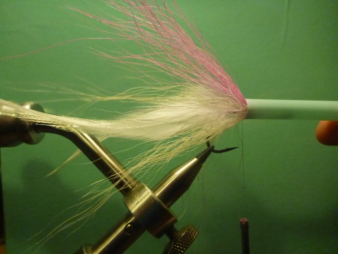 Anschließend zwei kleine Bündel Bucktail. Bei den Bucktailbündeln sollte man darauf achten, dass man überwiegend die langen Haare nimmt und die Unterwolle und kürzere Haare entfernt. |