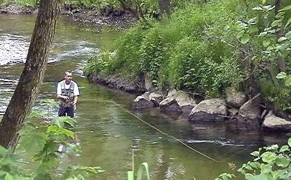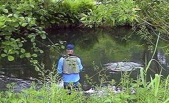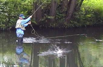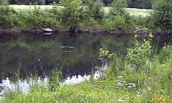 | Im Hauptteil dagegen, der tief und schnell, umstanden von Erlenbäumen und -gebüsch durch bunte Blumenwiesen zieht, verraten sich die Flossenträger nur durch mehr oder weniger häufige Ringe an der Oberfläche. Hier dürfte das Fischen in den frühen Morgenstunden und am Abend den besten Erfolg versprechen. Eine weitere beliebte und deshalb auch oft besuchte Stelle befindet sich direkt unterhalb des sich anschließenden Wehres. |