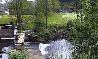 | Da die Hauptwassermasse durch den ehemaligen Mühlenkanal fließt, ist der restliche Flussteil eher zu einem breiten Bach geworden, der dem Angler auf der linken Seite der Mühleninsel über Rieselstrecken und kleine Schwellen entgegenströmt. | ![]() |