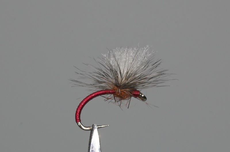 Haken: 31160 Super Grub #14 Bindeseide: Danville´s 70 Denier 6/0 rot Körper: Bindeseide rot Thorax: Squirrel Dubbing Orange Hechel: Grizzly Sichthilfe: Polypropylene weiß