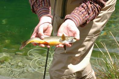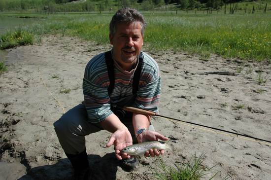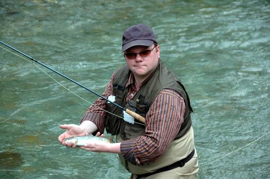 Hier – an der Catch & Release- Strecke - sollten wir nun für die nächsten Stunden von einem Begeisterungssturm in den nächsten verfallen. Innerhalb 2 Stunden fingen wir wohl 25 Bachforellen zwischen 25 – 40 cm – mit verschiedensten Fliegenmustern von schwarz über braun und beige bis grau - an ca. 2-3m langen 14er-16er Vorfächern. Die Größe der Fliegen war uninteressant – es wurde alles genommen. Nur die größten