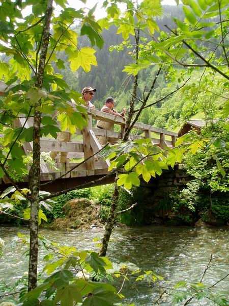 Zur Mittagspause ging es dann in den Talwirt – eine rustikale Gaststätte am Ende der öffentlichen Straße, die auch von Busgruppen frequentiert wird. Hier warteten wir unser mittagliches Gewitter ab und stärkten uns für die Nachmittagschicht. Vor lauter Übermut wagten wir uns nun an die Passage kurz unterhalb des Talwirts mit mehr Gefälle und rauschendem Bach, Kiesbänken und tiefen Gumpen. |