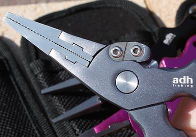 Schon beim ersten Handhaben bemerkt man die erstklassige Verarbeitungsgüte dieser Zange: sie liegt schön geformt und leicht in der Hand, die Schneiden des Clips und die Verzahnung der Backen fügen sich beim Schließen absolut 100%ig exakt und ohne Spiel zusammen und der Federdruck im Mechanismus der Hauptachse wurde exakt bemessen, nicht zu schwach und nicht zu stark. Die ADH Zange ist korrosionsgeschützt und voll salzwassertauglich, sie kann eingesetzt werden als Hakenlöser, zum Widerhaken andrücken und zum Schneiden von Angelschnur & Vorfächern. Hergestellt aus Flugzeugaluminium und gefertigt auf CNC Maschinen mit geringsten Toleranzen verfügt die Zange über geschraubte und daher austauschbare, gezahnte Klemmbacken und Clipper-Schneiden aus Karbonstahl, die nicht nur Angelschnüre, sondern auch Titan- und Stahlvorfächer schneiden können! |