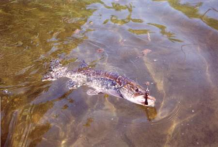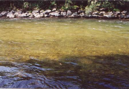 | Auch eine weitere Hechterfahrung dürfte ich noch machen: Ich fischte mit einem kleinen Streamer schön in einem der großen Pools. Auf einmal schwamm ein schöner Hecht (so 70 bis 80cm) bis an Ufer hinterher, öffnete sein Maul und schloß es mit meinem Streamer wieder. Der Anschlag ging ins Leere: Der Hecht hatte des Streamer einfach abgeknipst. Nach anschließenden Versuchen mit Stahlvorfach und Co. war kein Hecht mehr zum Anbiß zu bewegen, obwohl einige prächtige Burschen zu sehen waren. |