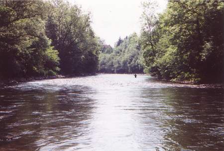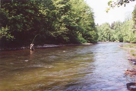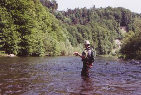 Zur Fischerei: Ich will nicht meckern, wir hatten ein paar schöne Tage an einem schönen Wasser, konnten neben Döbeln, Barben und Hechten auch einige Forellen bis über die 40cm-Marke fangen. Allerdings halten wir die Kartenpreispolitik für etwas verfehlt: Da muß zuerst in den Verein eingetreten werden, eine Aufnahmegebühr sowie eine Mitgliedsgebühr berappt werden, die Tages- /bzw. Dreitageskarte gelöst und zuletzt noch das staatliche Fischerbücherl erworben werden, so dass man insgesamt den stolzen Preis von ca. 130,--DM pro Tag und Person berappt - und das für ein landwirtschaftlich belastetetes Gewässer mit streckenweise starker Luftverpestung durch die Tierkörperverwertung, mit Leitfischarten wie Döbel, Barbe und Hecht, ferner Regenbogen- und Bachforellen! Das sollte man sich vor einem Besuch gut durchdenken. Aber entscheiden Sie selbst - zum Glück gibt es verschiedene Geschmäcker. Ein paar