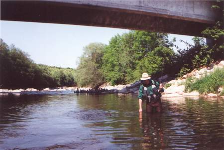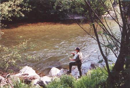 Bei der Waterei war Vorsicht angebracht - der Flußgrund ist von einer Algenschicht überzogen, ausserdem lies einen das sichtige Wasser oftmal die Tiefe verschätzen. Klaus hatte als Erster Kontakt mit ein paar guten Fischen unterhalb der Straßenbrücke, Stefan nahm sich die rechte Flußseite aufwärts vor und ich die linke Seite. Es war sonnig und warm - die Fischerei war angenehm und alle bendelten mit kleinen und mittleren Bach- und Regenbogenforellen an. |