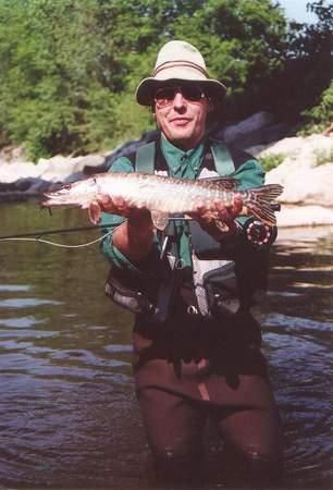 Hier ist eine sehr schöne Trockenfliegenfischerei möglich - allerdings ist beim Waten Vorsicht geboten - der Strömungsdruck ist nicht ganz ungefährlich. Auch hier konnten wir alle schöne Bach- und Regenbogenforellen, sowie vereinzelt Saiblinge fangen. links: hübsche Barbe |