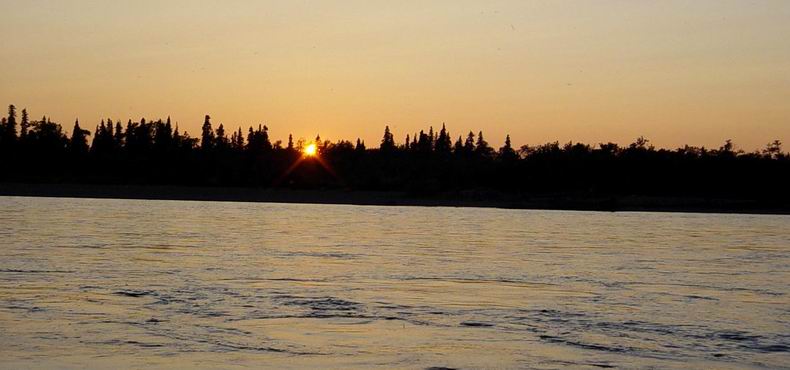 Ein beschwerlicher Tag geht nun so langsam zu Ende und wir alle sitzen glücklich um unser kleines Feuer und müssen erst mal die ganzen Eindrücke des Tages auf uns wirken lassen. Es ist schon immer etwas Besonders, wenn der erste Tag in der Natur zu Ende geht. Morgens waren wir noch in der Zivilisation und nun sitzen wir mutterseelenallein in der Wildnis Alaskas, 250 km fern der Zivilisation. Ein paar Vögel zwitschern und ab und zu hört man es im Wasser platschen wenn ein Fisch nach seinem Abendbrot schnappt. Wir kommen langsam zur Ruhe und können via Satellitentelefon kurz in Deutschland Bescheid geben, dass alles bis jetzt gut gelaufen ist. Es wird langsam dunkel und wir ziehen uns in unsere Zelte zurück. Ich hab mich so richtig schön in meinen Schlafsack eingemümmelt und schlafe sofort ein. Mitten in der Nacht werde ich aufgerüttelt, unser Zelt wackelt wie verrückt und ich greife instinktiv sofort zu meiner Pistole. Aber es ist nur ein starker Wind, der in der Tundra sehr tückisch sein kann. Ich kenne Einige, die auf diese Weise schon ihr Zelt verloren haben, daher ist es unheimlich wichtig, das Zelt richtig zu positionieren und gut abzuspannen. Hoffentlich bleibt das Wetter wie es ist. |