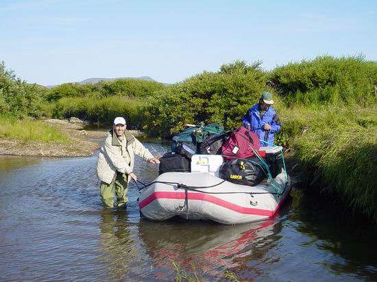 | Am nächsten Morgen lacht uns die Sonne wieder an. Wir stehen auf und nach ausgiebigem Frühstück ist gegen 11.00 Uhr alles wieder auf unserem Boot verstaut und es kann weiter gehen. Wir wollen heute eine Stelle erreichen, an der ein größerer Creek in unseren Fluss mündet und an der es sehr gut zum fischen ist. Leider müssen wir feststellen, daß uns immer noch oft das nötige Wasser zu floaten fehlt. Es wird ein anstrengender Tag mit gelegentlichen kurzen Regenschauern, aber nach 7 Stunden ziehen und gelegentlichem Floaten erreichen wir den Flusseinlauf und das Wasser beginnt schön tief zu werden. Wir legen an und errichten unser Camp. Es ist ein traumhaft schöner Patz. | ![]() |