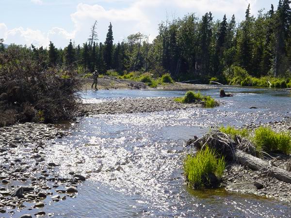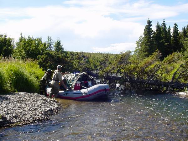 | Heute gehen wir früh ins Bett in der Hoffnung, Morgen besser Verhältnisse vorzufinden. Aber auch am nächsten Tag scheint das Wasser tot zu sein. Das einzigste Highlight ist ein strammer Elchbulle, der der morgens direkt durch unser Camp läuft. Es ist schon aufregend wenn man Morgens aus dem Zelt schaut und so ein Riese trottet an einem vorbei. Wir entschließen uns, weiter zu floaten zu unserem letzten Camp. Wir befinden uns mittlerweile auf dem großen Hautstrom, der an machen Stellen gut einhundert Meter breit ist und richtig “Zug” hat. Wir kommen gut voran und befischen einige Creeks, die bei meinem letzen Trip top waren. Aber auch hier herrscht gähnendes Nichts. Wir machen uns schon Vorwürfe das wir unseren Traumpool zu früh verlassen haben, aber auch das gehört zum Floaten. | ![]() |