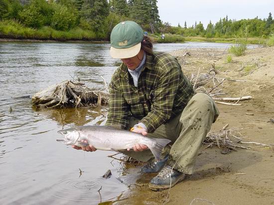 | Heute war ein besonders schöner Tag und wir hatten beinahe 30 Grad gehabt: Unsere ständigen Begleiter, die Balck Flies, sind da mit uns ganz einer Meinung und beglücken uns in einer derartigen Stückzahl und Aktivität, das uns nur unsere Buckshirts noch einigermaßen vor Ihren Attacken schützen. Nach einer halben Stunde Fußmarsch entdecken wir Hermann in der Ferne, der uns auch sieht und wie wild winkt. Als wir bei ihm sind, verstehen wir, warum er so lange Zeit weg war. Wir stehen an einer Flachwasser- zone, gegenüber ist das Wasser etwa einen Meter tief und da stehen Sie, hunderte von Silberlachsen !!! Es ist eine wunderbare Stimmung am Wasser: Die Sonne beginnt gerade hinter den Bergen zu verschwinden, es ist absolut windstill und vor uns stehen hunderte von Lachsen. Jedes mal, wenn die Fliege auf das Wasser klatscht und abzusinken beginnt, ist es wie im Aquarium zu Fischen. | ![]() |