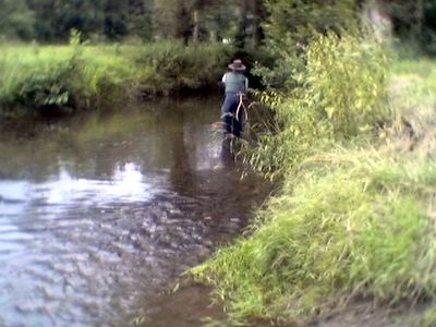 Gegen Nachmittag, etwa 15:00 Uhr, zeigten sich vermehrt Ringe an der Oberfläche und wir erlebten eine wahre Sternstunde auf Trockene. Fast an jedem Gumpen schien das Wasser zu kochen und unsere Sedges verschwanden in hungrigen Salmoniden-Mäulern. Alle um die 30cm. Nach etwa einer Stunde war der Spuk vorbei und es stellte sich eine ungewohnte Ruhe ein. Es tat sich erst mal nichts mehr, nur eine kleine Äsche und ein kleiner Döbel verirrten sich an der Goldkopfnymphe. Ab etwa 19:30 Uhr bis 21:00 Uhr stellte sich wieder eine gewisse Beißfreudigkeit ein und 2 Bachforellen und ein Bachsaibling fanden den Weg in unsere Weidenkörbe. |